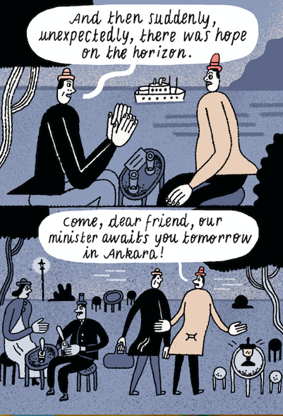 Based on the “Law on the Restoration of Civil Service”, which was passed in 1933, the National Socialists were able to dismiss numerous Jews and dissidents from public service. Among them was Philipp Schwartz, an anatomist and pathologist teaching at Frankfurt University. Upon his dismissal, he was forced to move to Zurich where he founded an association for German scientists in exile. Schwartz successfully struck up relations with Turkey and helped several hundred scientists to emigrate across the Bosporus. Schwartz himself moved to Istanbul where he was made director of the Institute of Pathology of Istanbul University. Julia Kluge’s comic tells the story of his emigration to Turkey as well as of his failed attempt to return to Frankfurt University after the war.