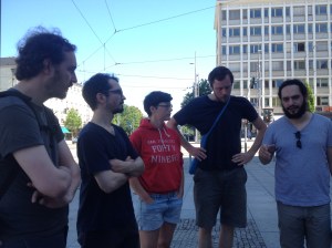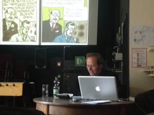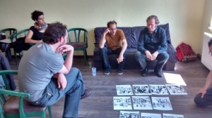 Throughout the workshop, we had a number of visitors who were involved in the project on various levels: Johanna Wand of Goethe Institute Naples spent two days with us, reporting on our project for the Goethe Institutes in Italy. David Schilter of Latvian comics publisher kuš! joined us on Tuesday. As he will again be in charge of the final publication, we spent a lot of time discussing deadlines, measurements and layouts with him. Lilian Pithan, who takes care of our project PR, came for a visit on Thursday and helped videographer Johannes Buchholz record a short round of interviews with the artists.